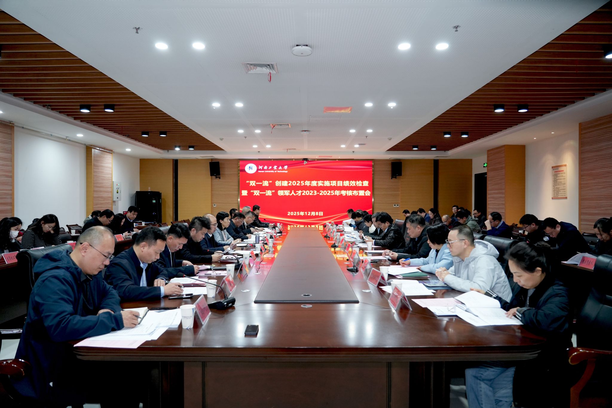 为全面总结“双一流”创建工作成效,精准部署绩效评价与领军人才考核工作,12月8日上午,我校在学术报告中心D204报告厅召开“双一流”创建2025年度实施项目绩效检查暨“双一流”领军人才2023-2025年考核布置会。副校长白艳红、纪委书记张玉安、副校长赵仁勇、学术副校长李鹏出席会议,纪委书记张玉安主持会议。党委宣传部、人事处、教务处、科技处、社科处、研究生院、国际交流合作处、财务处、信息化办公室、产业技术研究院、国际教育学院等部门主要领导,粮油食品学院、粮食和物资储备学院、机电工程学院、土木工程学院、信息科学与工程学院、化学化工学院、生物工程学院院长,2025年度实施的“双一流”项目负责人、食品科学与工程学科带头人、学科方向带头人、团队带头人、团队骨干及学科建设办公室全体人员参加会议。