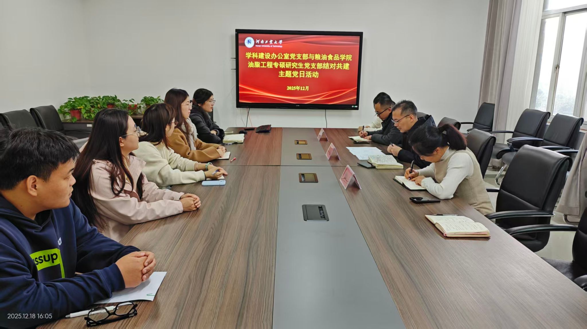 为深入学习贯彻党的二十届四中全会精神,扎实推进校党委“双融双促”机关党支部与学院党支部结对共建行动部署,12月18日,机关党委学科建设办公室党支部和粮油食品学院油脂工程专硕研究生党支部在行政楼B201开展结对共建主题党日活动。学科建设办公室党支部全体党员、油脂工程专硕研究生党支部委员及党员代表参加会议。活动由学科建设办公室党支部书记孙尚德主持。